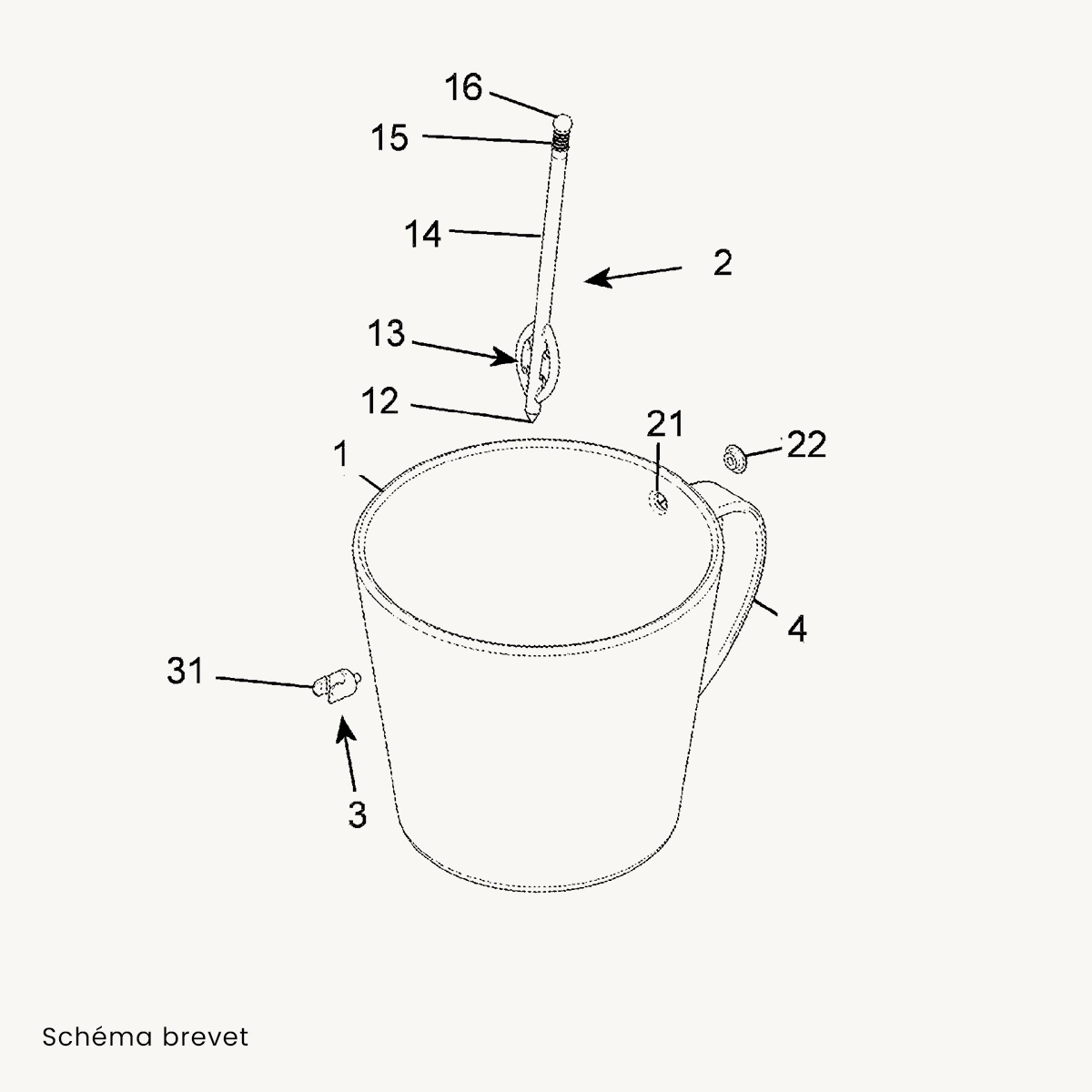 22 - 31 Pièces composant le clip venant se fixer au travers du trou (21) de la tasse.